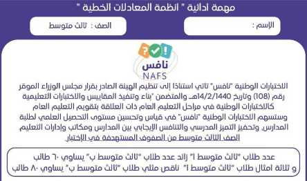 اجابة مهمة أدائية " أنظمة المعادلات الخطية" نافس NAFS. الاختبارات الوطنية "نافس" تأتي استنادًا إلى تنظيم الهيئة الصادر بقرار مجلس الوزراء الموقر رقم (108)؟